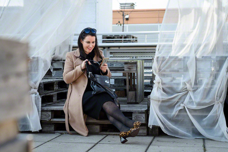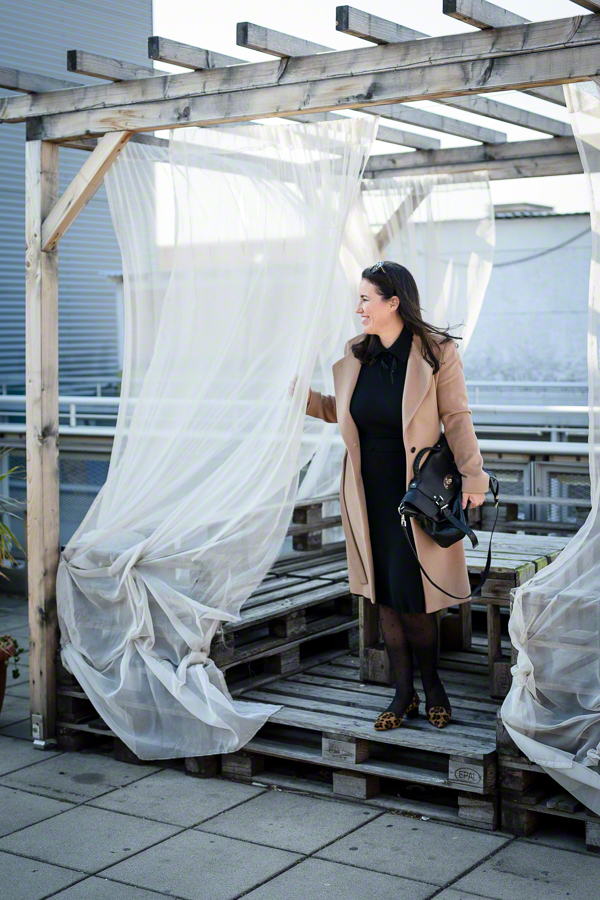 Kleid: Lawrence Grey Schustermann & Borenstein) , Mantel: Max Mara Weekend (P&C), Tasche: Mulberry, Schuhe: Dominici ,Sonnenbrille: Tom Ford by Optic Opera