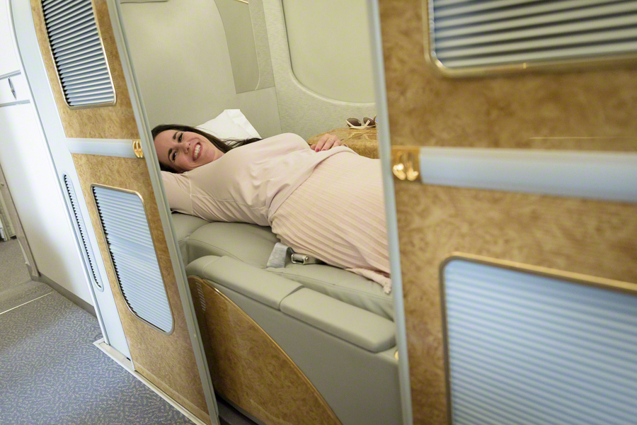 Fliegen fast wie im eigenen Privatjet. Eine eigene Kabine, die man mit der Türe verschließen kann, eine Dusche an Bord und eine Lounge-Bar an der man sich einen Drink zubereiten lassen kann. Mit feinem Essen wird man hier zu jeder Zeit verwöhnt. - Emirates A380 Business Class