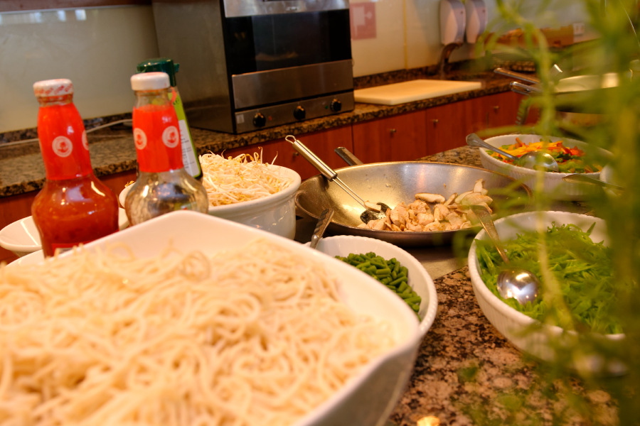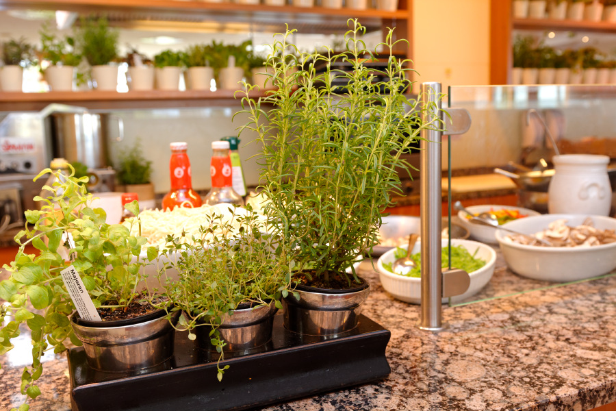 Zu Mittag gibt es großes Salatbuffet, zwei frisch zubereitete Suppen, Brotvariationen und ein kleines warmes Gericht, das der Koch frisch für jeden Gast zubereitet.
