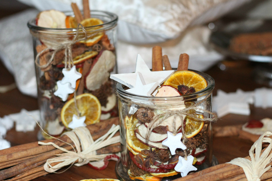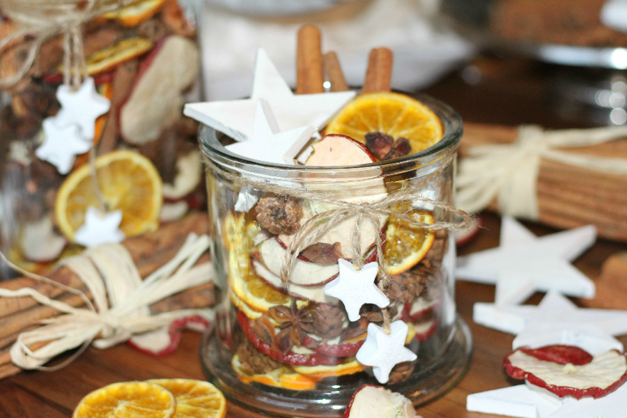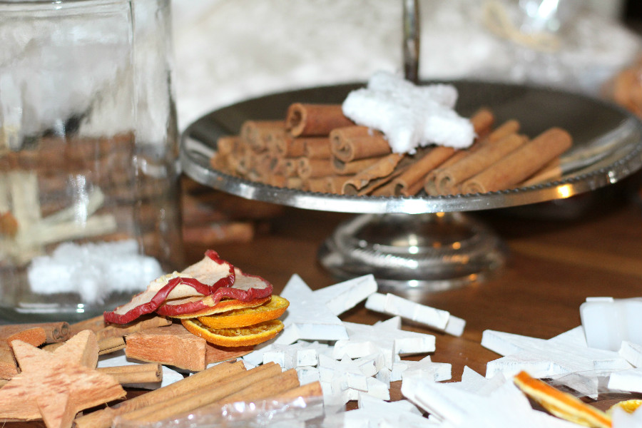 Ich verbinde mit der Weihnachtszeit allerdings auch viele Düfte und Gerüche … Mandarinen, Orangen, Äpfel, Zimt, Weihrauch, Tannenzweige und natürlich den Duft von Keksen. Deshalb dekoriere ich auch sehr viel mit diesen Naturmaterialien. Ich finde man kann mit einfachen Mitteln, sein Zuhause stimmungsvoll und weihnachtlich gestalten. Ich dekoriere z. B. gerne Schalen und Glasgefäße mit Orangen- und Apfelscheiben, Zimtstangen und Gewürznelken. Noch ein paar Weihnachtssterne oder Glasschmuck dazu und fertig sind meine Weihnachtsschalen. Der Duft ist einfach herrlich und hält bis zum Ende der Weihnachtszeit an. Meine Dekomaterialien kaufe ich übrigens zu einem Großteil bei Depot.