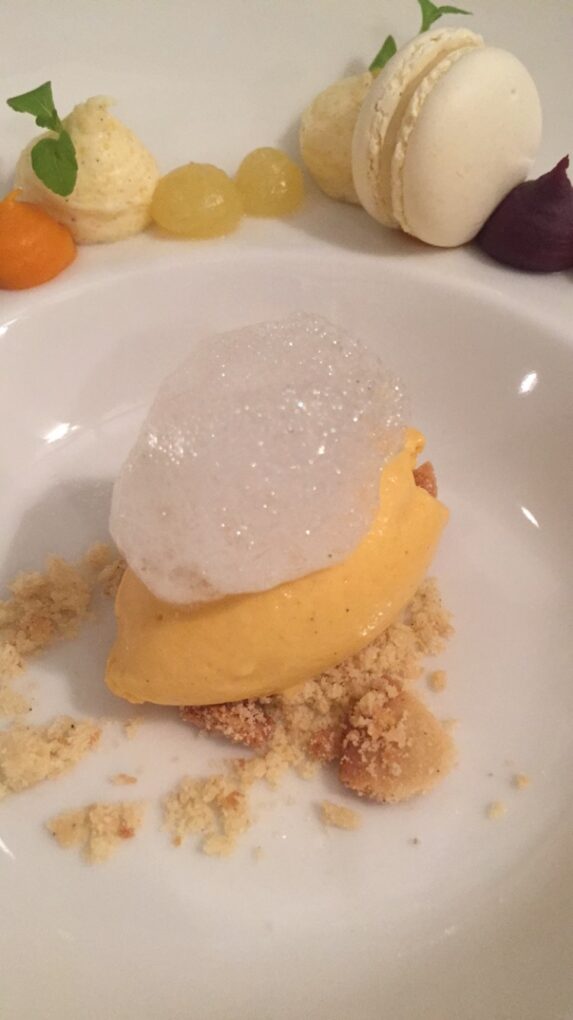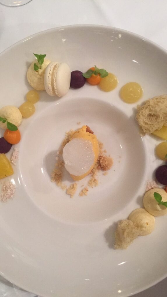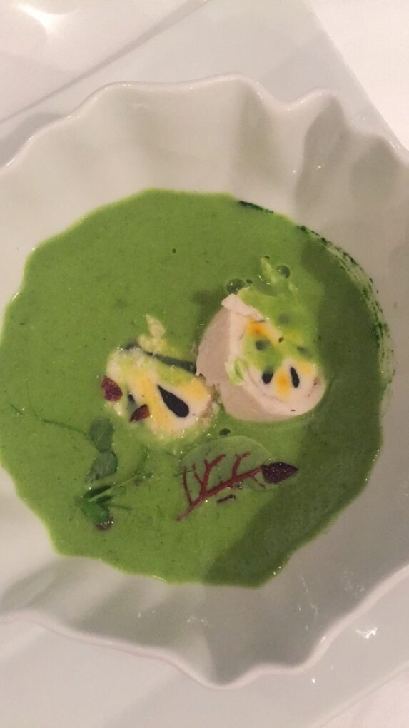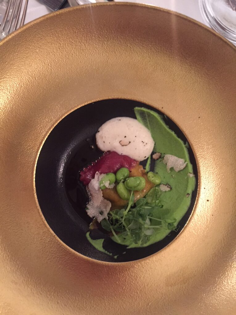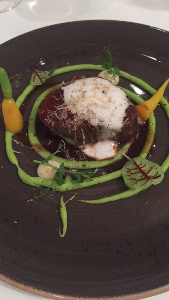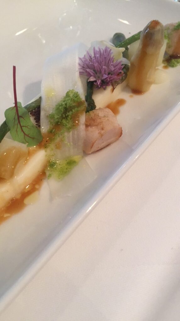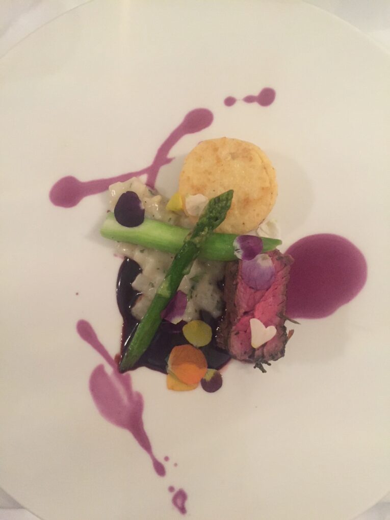 Spargel mit Kaninchen, Bärlauchsuppe mit Kärntner Laxn und Kaviar, Carabinero mit Zucchiniblüte, Madeira und Erbse, Rinderfilet mit Trüffel, Petersilie, Portwein und Sellerie und als krönenden Abschluss gab es eine Desservariation mit Süßkartoffel, Ananas, Kardamon und Polenta.