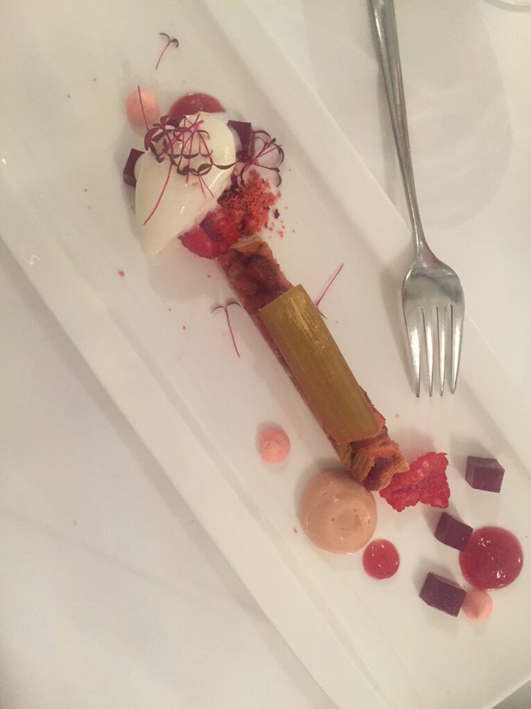 Amuse Bouche, Rindertafelspitz, Ochsenschlepp Tea, Rinderbackerl im Raviolo, Yuzusorbet, auf Frühlingskrätern gedämpftes Weiderind und Rhabarber Délice