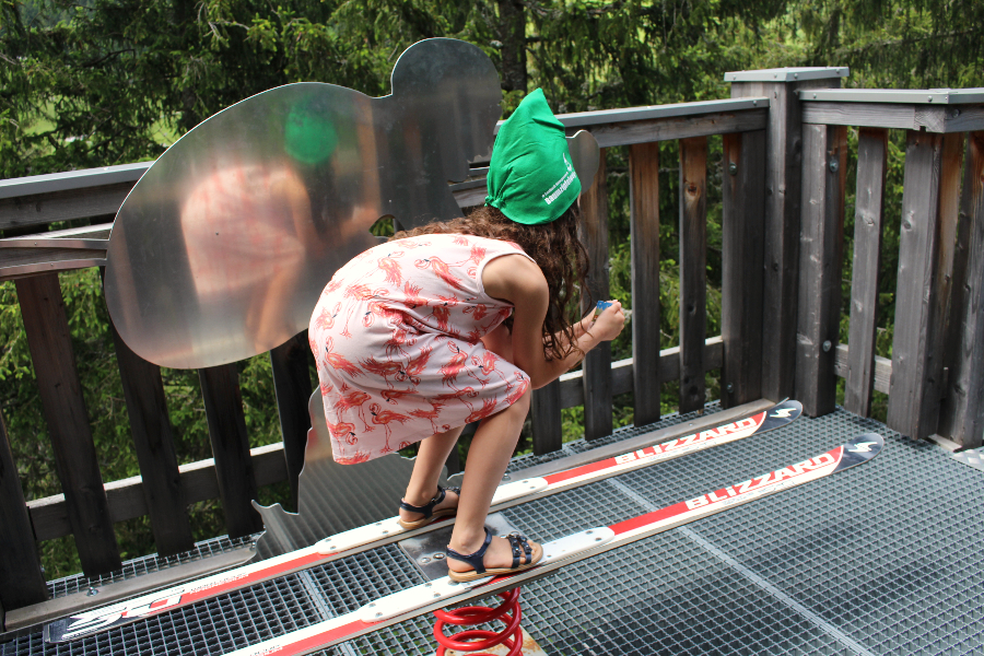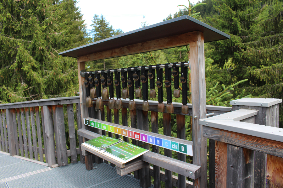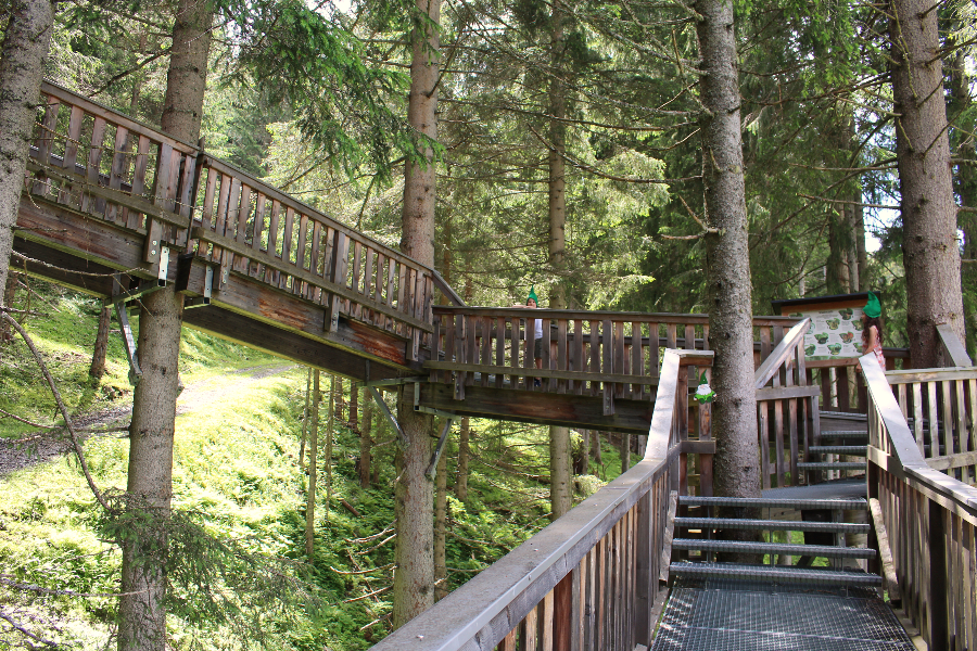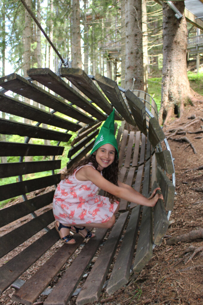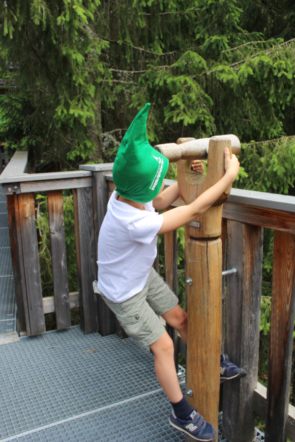 Der Wipfelweg ist aus massivem Lärchenholz und besteht aus 11 Türmen und Plattformen, die bis zu 30m hoch sind. Dazu kommen 33 Brücken, ein Skywalk, zahlreiche Schautafeln und Spielestationen für Kinder und Familien. Beim Eingang bekommt man zu den Eintrittskarten auch eine witzige grüne Baumzipfelmütze. Diese macht auf jeden Fall gute Laune, nicht nur bei den Kleinen.