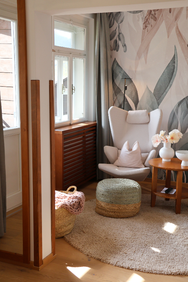 Diese Suite ist von Gemütlichkeit, Gelassenheit und Geborgenheit geprägt und steht ganz im Zeichen des Skandinavischen Einrichtungsstils HYGGE. Die harmonische Farbgestaltung, der wunderschöne Rückzugsort mit Schaukelstuhl und die vielen Details haben mir sehr gut gefallen. In Erinnerung sind uns auch die kuscheligen Socken geblieben, die wir am Bett liegen hatten.