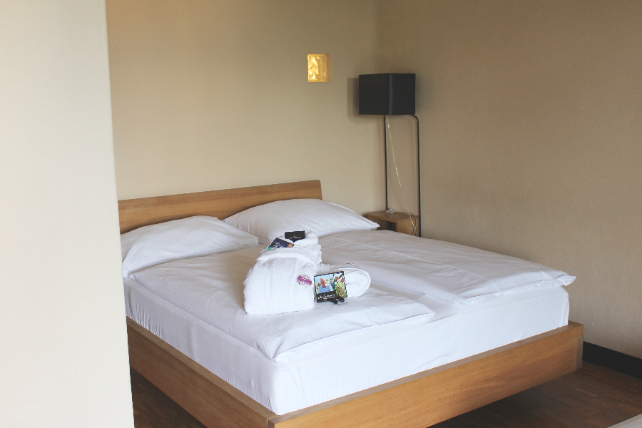 Sämtliche Wohneinheiten sind mit hochwertigem Vollholz eingerichtet. Ganz nach dem Prinzip Upcycling wurde ein nachhaltiges Konzept integriert. Denn natürliche Materialien wurden mit dem bestehenden Innenleben der Schränke kombiniert. Indirekte Beleuchtungskörper, verstellbare Leselampen und handgeformte Keramikgriffe runden das Interior Konzept ab. Erwähnenswert ist auch die Bettwäsche aus nachhaltiger Bio Fairtrade Baumwolle, die für einen gesunden und nachhaltig fairen Schlaf sorgt. Ein rundum perfekt durchdachtes Konzept zieht sich durch den gesamten Hotel- und Thermenbereich.