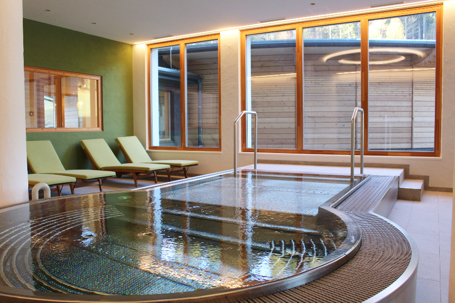 Neben der Wasser- und Saunawelt und tollen Rückzugsmöglichkeiten im gesamten Hotelbereich, gibt es übrigens auch einen perfekt ausgestatteten Fitnessraum mit Blick in die Natur.