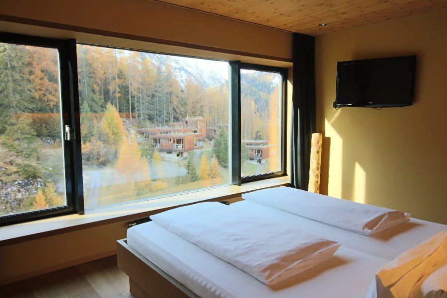 Große Panoramafenster ermöglichen von allen Bereichen im Resort eine atemberaubende Aussicht auf die Bergwelt. Egal ob man im Pool schwimmt, auf der Terrasse einen Cafe genießt oder in einem der Ruheräume ein Buch liest … man hat das Gefühl ein Teil der Natur zu sein. Diese Aussicht genießt man übrigens auch von jedem Zimmer, egal welcher Kategorie.